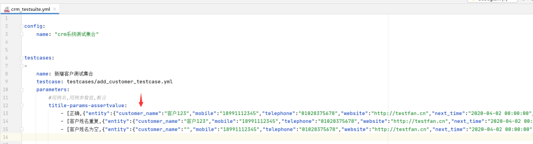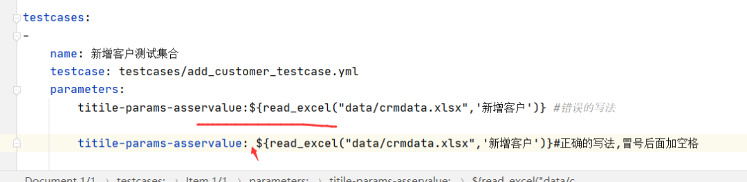 'titile-params-asservalue:${read_excel("data/crmdata.xlsx",\'新增客户\')}' is not of type 'object'因为没有加空格,格式不对