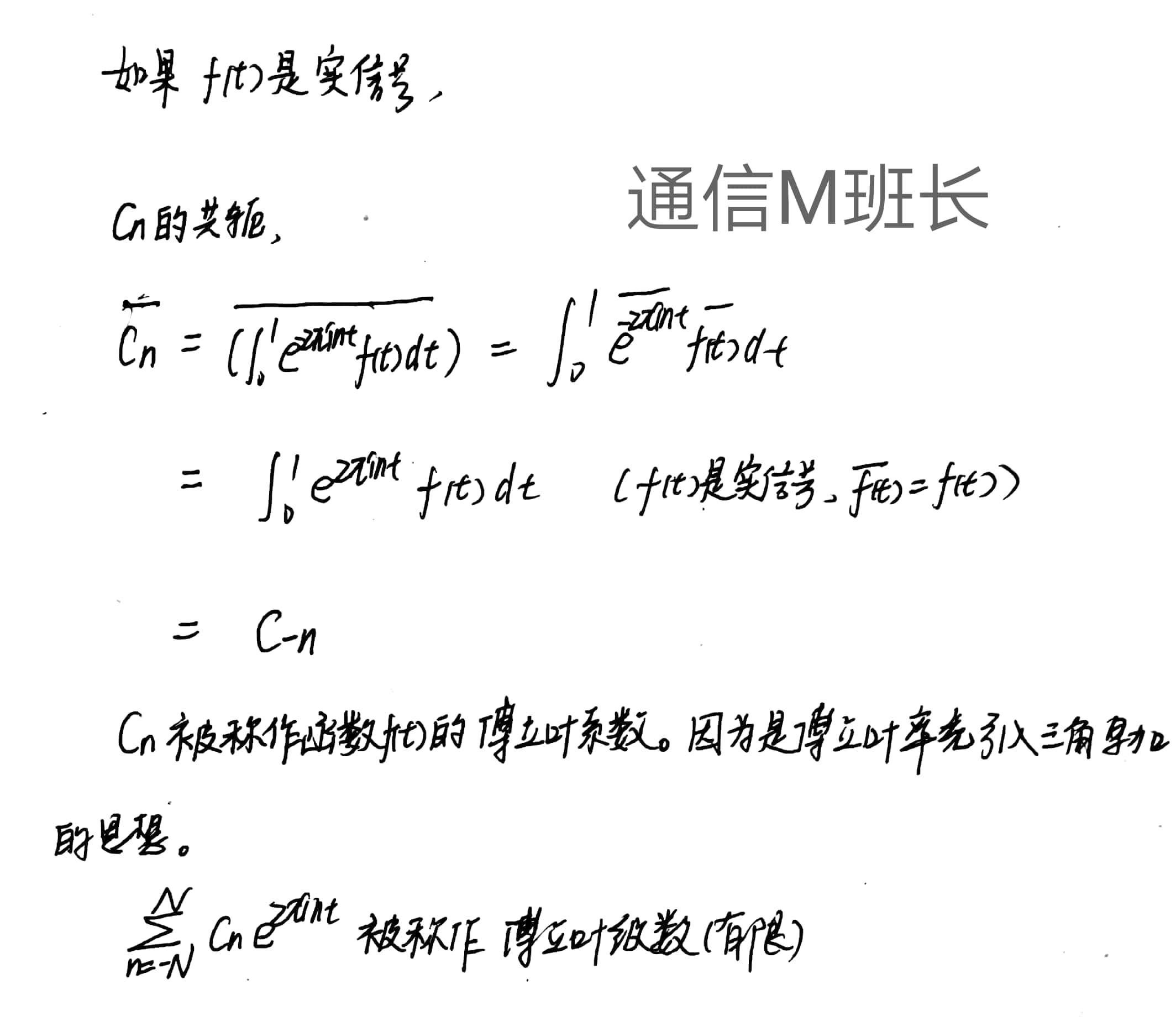 在前面的计算中,我们没有假设f(t)是一个实信号。但是,如果我们确实假设f(t)是实信号,那么系数Cn^=C−n,如下: