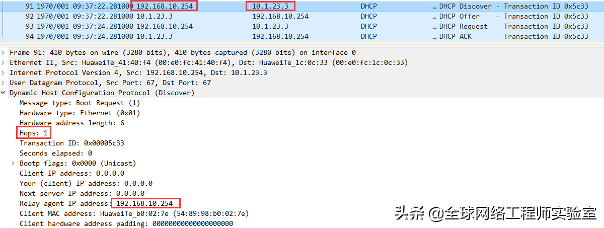 此时我们可以看出是DHCP中继服务器10.254和DHCP服务器23.3进行交互DHCP报文
