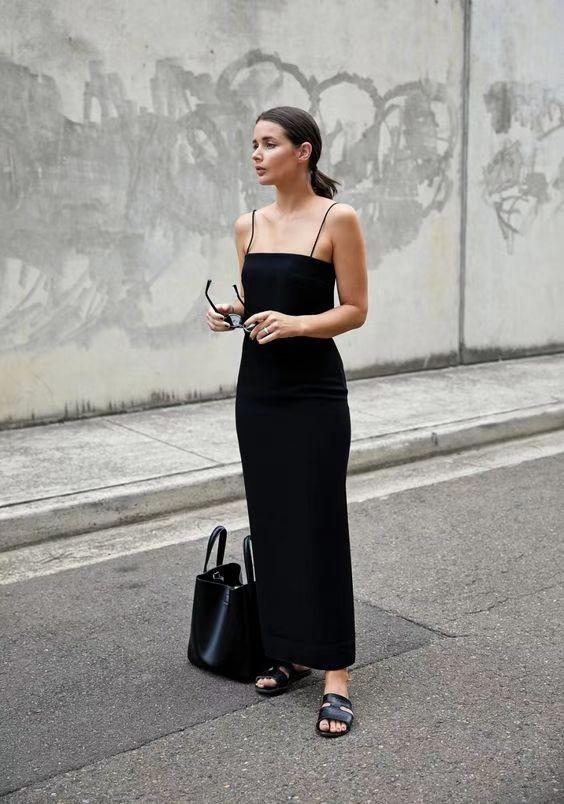 纯黑色吊带针织连衣裙,裙摆下端采用直筒式的剪裁,可以更好的修饰胯宽腿粗的问题,腰间又利用自然的收紧设计凸显小蛮腰,加上这款裙子的腋下抹胸以及极细的肩带可以完美的展现出身材优势,搭配上墨镜以及平底拖鞋,随性又休闲。