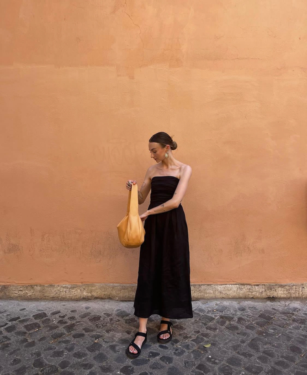 在夏天穿小黑裙也可以是休闲的随性的,这款黑色抹胸小黑裙,裙摆极为宽大,可以较好的包容腿型问题,配上黑色厚底凉鞋以及亮黄色手提袋,造型简约而不单调。