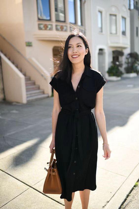近几年来,衬衫连衣裙成了越来越多职场女精英的钟爱的职场单品之一,纯黑色衬衫裙可以展现出职场女性身上的稳重感。