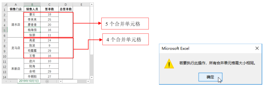 如果表格中合并的单元格大小不相同,如左下图所示的“门店日报表 3”,那么使用上述公式,则会弹出右下图所示的提示对话框,提示“所有合并单元格需大小相同”,也就是说,通过此方法是行不通的,此时可以考虑使用两个求和函数来实现一次性求和。