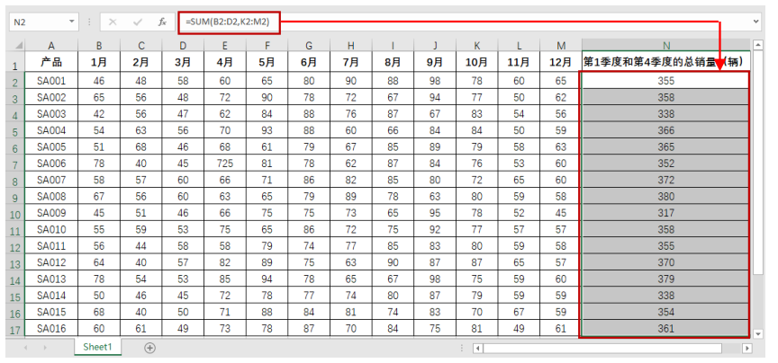 例如,对各汽车产品第 1 季度(1~3 月)和第 4 季度(10~12 月)的总销量进行统计时,需要先在 N2 单元格中输入公式“=SUM(B2 : D2,K2 : M2)”,按【Enter】键计算出产品“SA001”的总销量,然后向下填充公式,即可计算出其他产品第 1 季度和第 4 季度的总销量,效果如图 2-5 所示。