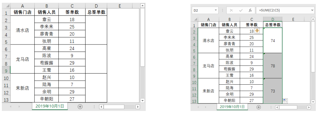 如果表格中合并的单元格大小相同,如左下图所示的“门店日报表 2”,那么在使用SUM 函数进行求和运算时,只需要在 D2 单元格中输入公式“=SUM(C2 : C5)”,然后向下填充公式,即可计算出 3 个销售门店的总签单数,效果如右下图所示。