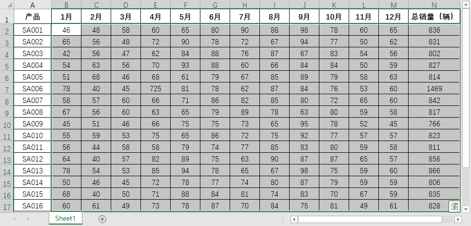 例如,A 是一家汽车销售公司,如下图所示为 A 公司 2019年各汽车产品每月的销量,对各产品的总销量进行计算时,可直接选择 B2 : N17 单元格区域,单击“公式”选项卡“函数库”组中的“自动求和”按钮,即可计算出各产品在 2019 年的总销量。