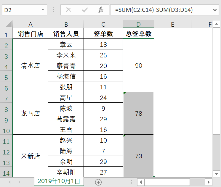 如果要计算其他销售门店的总签单数,则可向下填充公式。