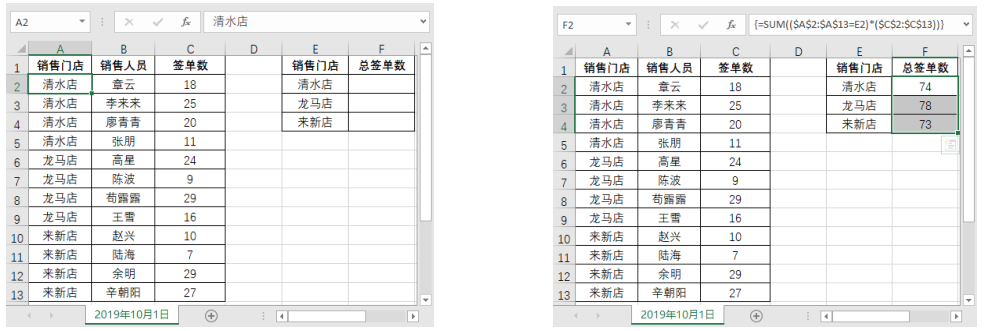 如本例中要对“清水店”的总签单数进行统计,需要在 F2 单元格中输入公式“=SUM(($A$2 :$A$13=E2)*($C$2 : $C$13))”,按【Ctrl+Shift+Enter】组合键,将公式转换为数组公式“{=SUM(($A$2 :$A$13=E2)*($C$2 : $C$13))}”, 并得出计算结果。