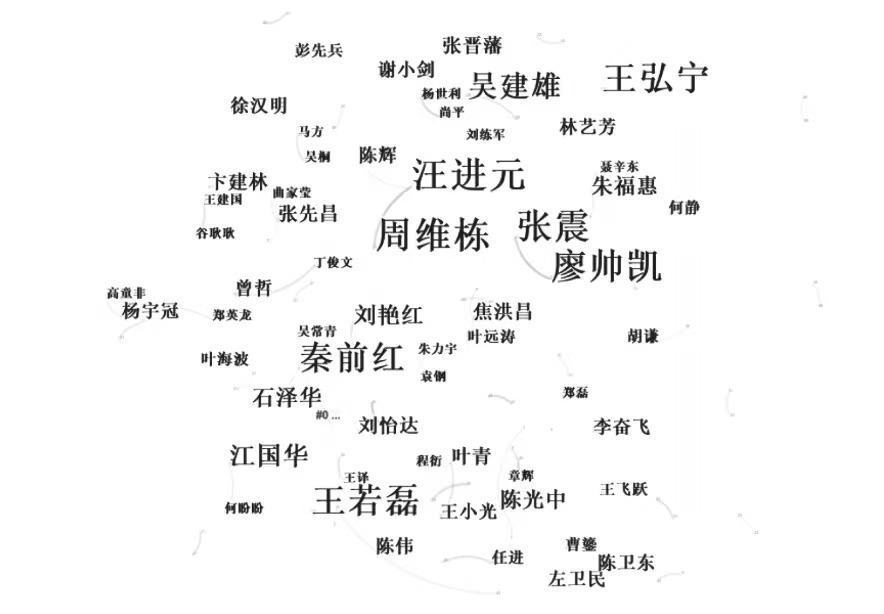 在CiteSpace5.7.R5界面中可以统计分析监察法相关发文作者分布情况。在其面板中,将时间区域固定为1992年1月至2021年12月,在节点类型(Node Types)中选择“作者”(Author),选择最小生成树算法精简网络(Minimum Spanning Tree,以下简称MST),最后得到364个节点,63条连线,密度为0.001的作者图谱,作者字体越大,其总体频次则越高,图3为经调整筛选后留下的部分总体频次数值较大的作者图谱。作者之间的连线代表二者间具有合作关系,连线越粗代表其合作共现的频次越高。根据图3显示,节点明显较大的作者分别为秦前红、周维栋、汪进元、张震、廖帅凯、王弘宁、王若磊、江国华、吴建雄。其中,秦前红更被学界称誉为“监察法研究第一人”,其在监察法领域的发文量也是最多的,高达22篇,并且根据CiteSpace自动生成作者网络数据叙述表,秦前红也是中心性排名最高的作者。其余学者也在监察法研究领域占据一定的地位,如吴建雄、江国华等人的发文量也有10篇之多(见表2)。从合作关系来看,张震和廖帅凯、周维栋和汪进元等人之间具有明显的合作关系。从论文的被引情况来看,中国政法大学陈光中发表于《中国法学》2017年第4期的《我国监察体制改革若干问题思考》一文被引数量最高,被引次数高达331次。除此以外,引用次数超过100次的还有33篇,其中秦前红发文量最多,有3篇均为100次以上的被引数,分别在《环球法律评论》《探索》《中外法学》期刊上发表。