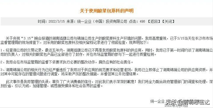 康师傅发完公告后,统一方便面马上发布了致歉声明,并表示5年内已经没有和湖南插旗合作,同时也停止了湖南锦瑞公司的供应商资格。今麦郎也站出来发布声明,表示并没有和曝光的湖南企业有合作关系。