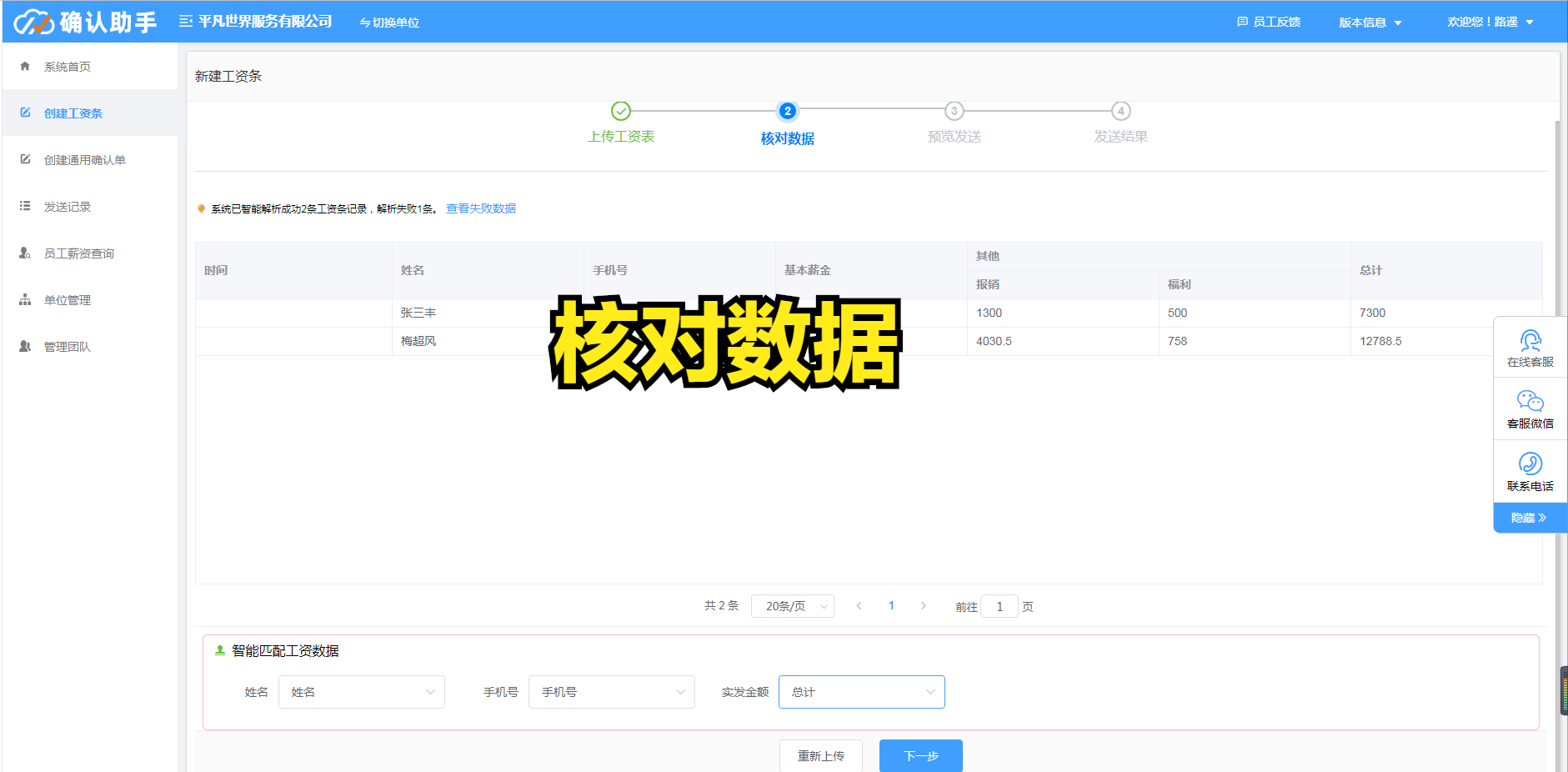 第二步:核对数据。 工资表上传后,系统将自动匹配员工联系方式,生成独立的个人工资发放名单。