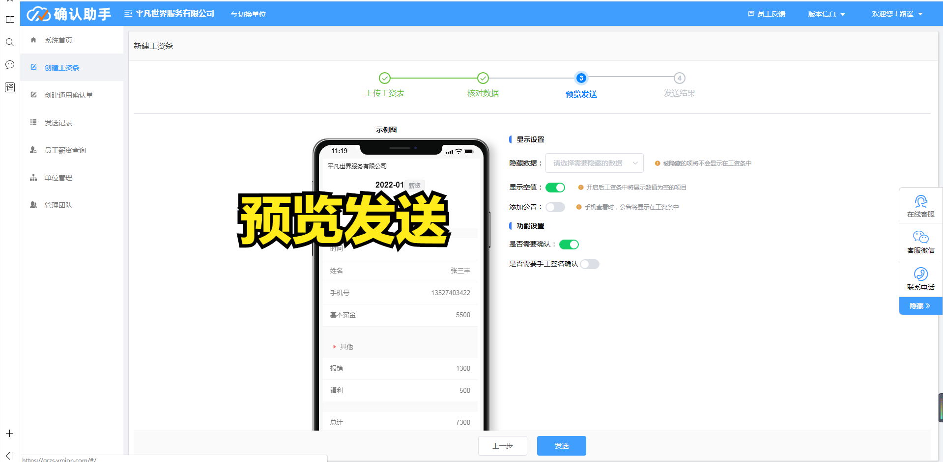 确认助手,快速批量发送方式,仅需三步便能实现全体员工工资条的制作与发放。