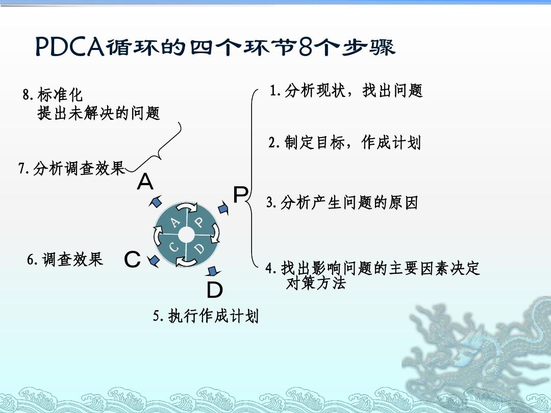 PDCA的八大步骤步骤一:分析现状,找出题目; 夸大的是对现状的把握和发现题目的意识、能力,发现题目是解决题目的第一步,是分析题目的条件。 步骤二:分析产生题目的原因; 找准题目后分析产生题目的原因至关重要,运用头脑风暴法等多种集思广益的科学方法,把导致题目产生的所有原因统统找出来。 步骤三:要因确认;区分主因和次因是最有效解决题目的关键。 步骤四:拟定措施、制定计划;(5W1H),即:为什么制定该措施(Why)?达到什么目标(What)?在何处执行(Where)?由谁负责完成(Who)?什么时间完成(when)?如何完成(How)措施和计划是执行力的基础,尽可能使其具有可操性。 步骤五:执行措施、执行计划;高效的执行力是组织完成目标的重要一环。 步骤六:检查验证、评估效果;"下属只做你检查的工作,不做你希望的工作"IBM的前CEO郭士纳的这句话将检查验证、评估效果的重要性一语道破。 步骤七:标准化,固定成绩;标准化是维持企业治理现状不下滑,积累、沉淀经验的最好方法,也是企业治理水平不断提升的基础。可以这样说,标准化是企业治理系统的动力,没有标准化,企业就不会进步,甚至下滑。 步骤八:处理遗留题目。所有题目不可能在一个PDCA循环中全部解决,遗留的题目会自动转进下一个PDCA循环,如此,周而复始,螺旋上升。