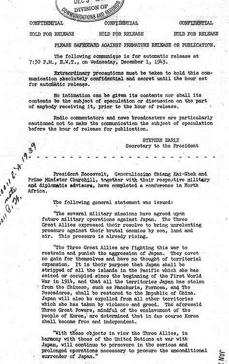 “剥夺日本自从1914年第一次世界大战开始后在太平洋上所夺得或占领之一切岛屿;在使日本所窃取于中国之领土,例如东北四省、台湾、澎湖群岛等,归还中华民国。”