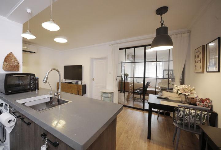 现在的厨房功能完全向外延伸,和客厅相连,并且设计了一个2.1x0.8 米的操作中岛,包含了洗菜、切配、储物等功能,形成一个开放式的餐厨空间。