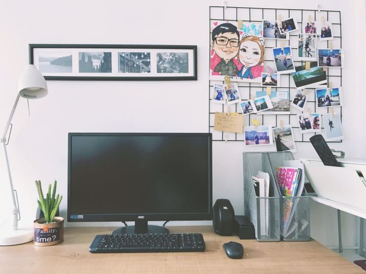书桌正对的这面墙布置出了一面照片墙,上面都是去国外或是逛街的时候随手拍的一些照片。那副最大的漫画肖像是年初去大阪USJ找画师画的,人民币200元。