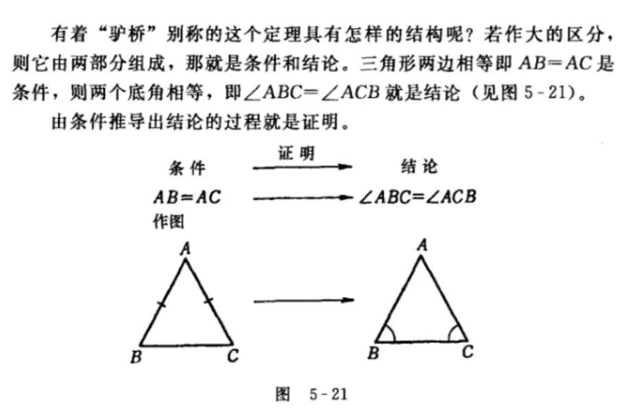 先看第一个难关:驴桥定理。这是《几何原本》的第五命题,可以简称为等边对等角。今天的同学们都知道三角形中,大边对大角,小边对小角,等边对等角,这个问题对当年的大学生而言,可是一个伤脑筋的难题。