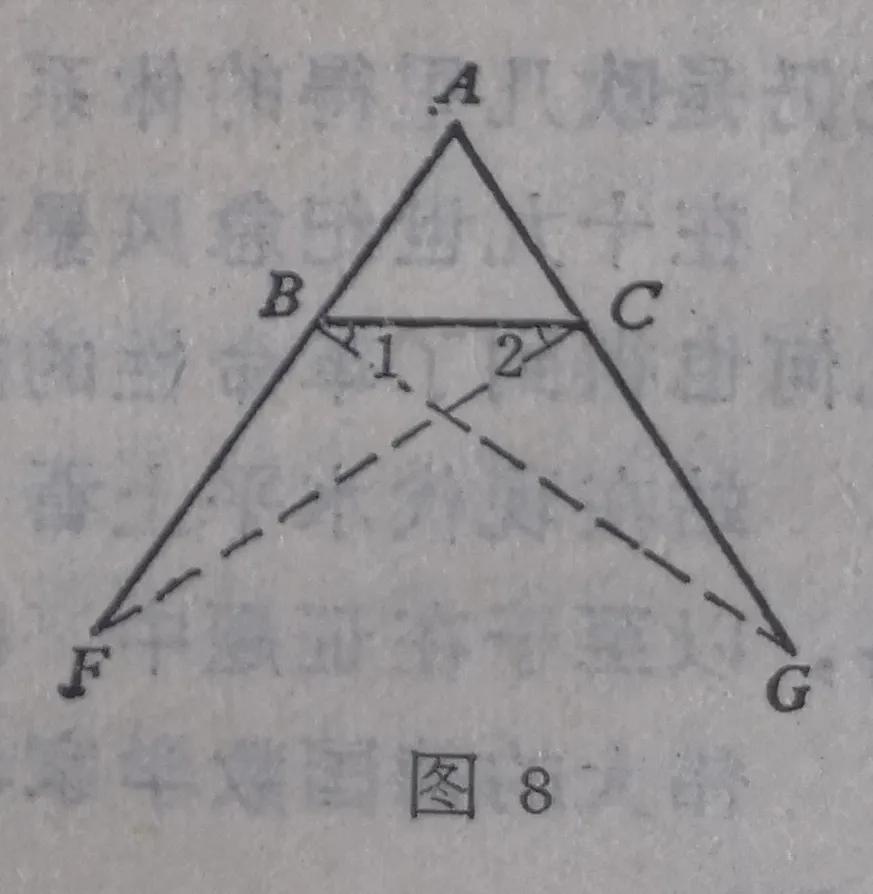 证明:如图8。延长 AB (公设2),在 AB 延长线上任取一点 F ,延长 AC ,以 C 为端点在 AC 延长线上截取 CG = BF (命题2),连接 FC 、 GB (公设1).