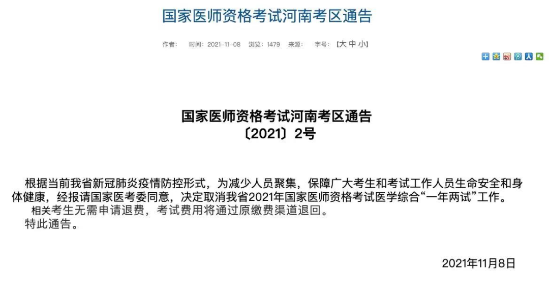 11月8日晚,原定于11月13日至14日举行的河南省2021年国家医师资格考试传来最新消息,取消了!
