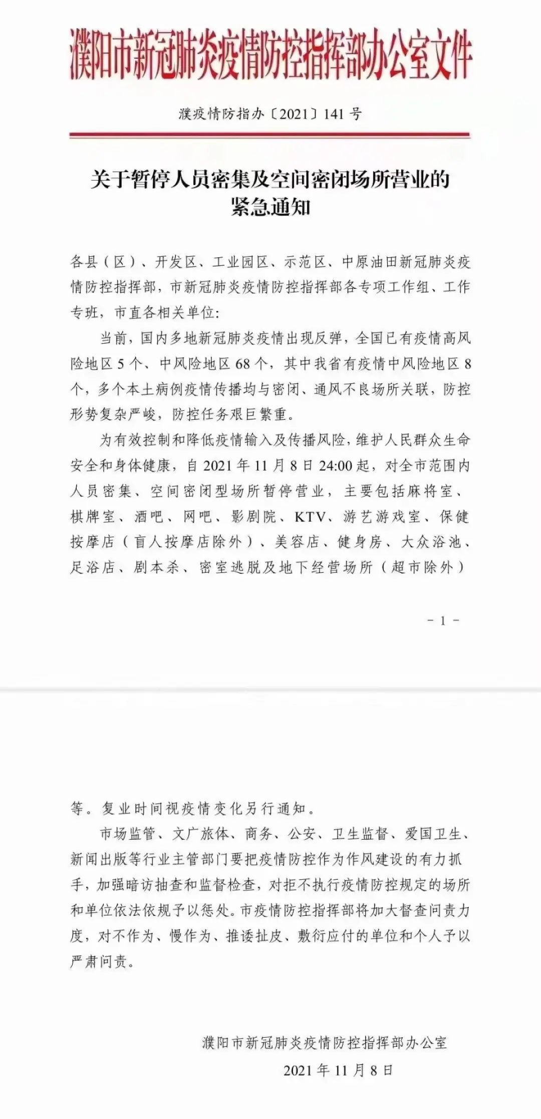 为有效控制和降低疫情输入及传播风险,自2021年11月8日24:00起,濮阳对全市范围内人员密集、空间密闭型场所暂停营业,主要包括麻将室、棋牌室、酒吧、网吧、影剧院、KTV、游艺游戏室、保健按摩店(盲人按摩店除外)、美容店、健身房、大众浴池、 足浴店、剧本杀、密室逃脱及地下经营场所(超市除外)等。复业时间视疫情变化另行通知。