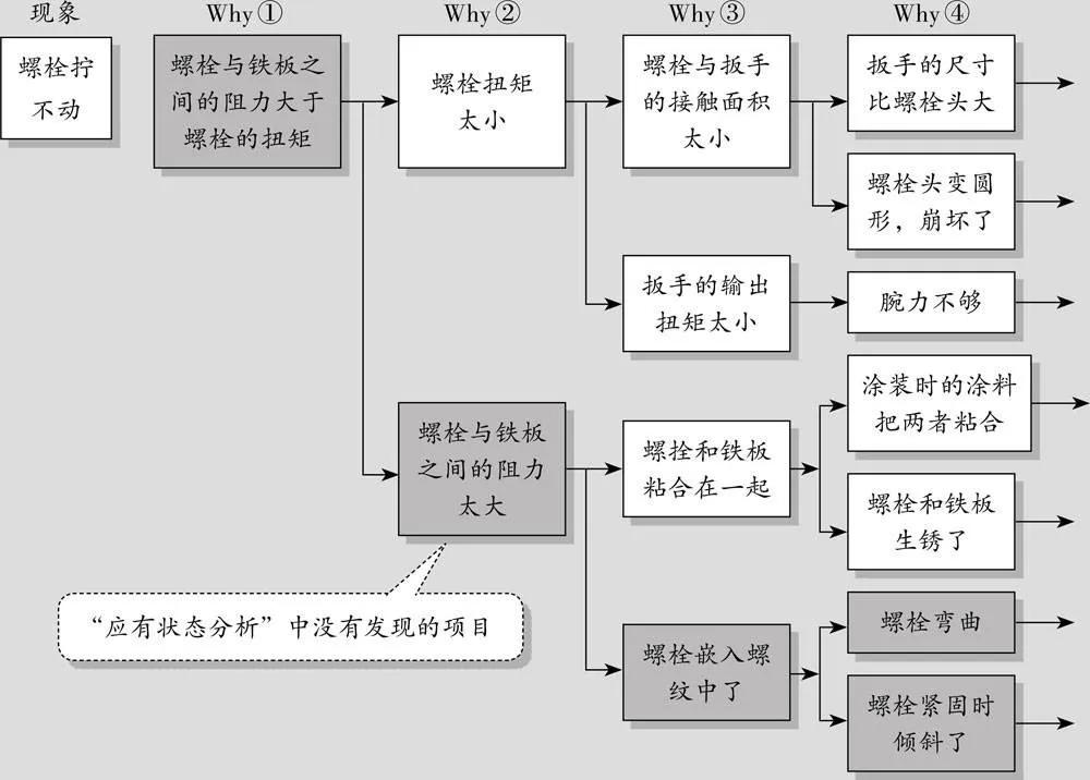 所谓why-why分析法,是使用系统化的思考模式,将发现的现象由应有状态或4M(人、机械、材料、方法)的关系筛选出引起现象的因素,再以筛选出的因素为基础,一方面仔细观察、调查现场或现物,另一方面追求真正的原因,并且研究再发防止对策。