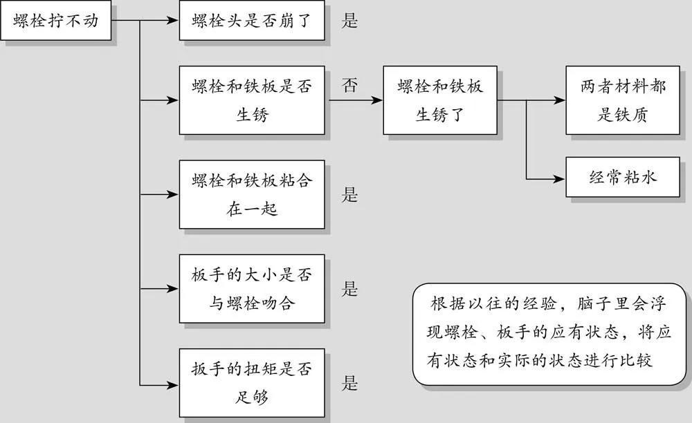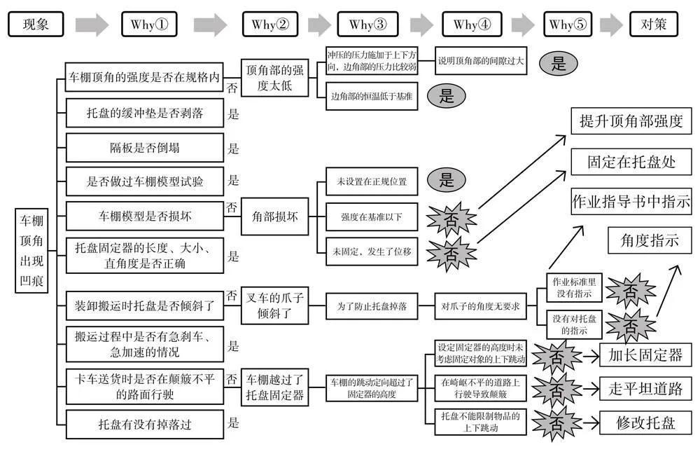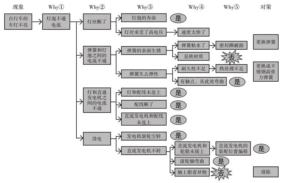 (2)充分理解问题部分的机制“构造”、功能机理。实施“为什么”解析的时候要集合大家的智慧。如果是机器故障,解析时要把出现问题的部分和相关部分的草图现场画出来。如果是业务问题,也要写出发生问题的业务流程。
