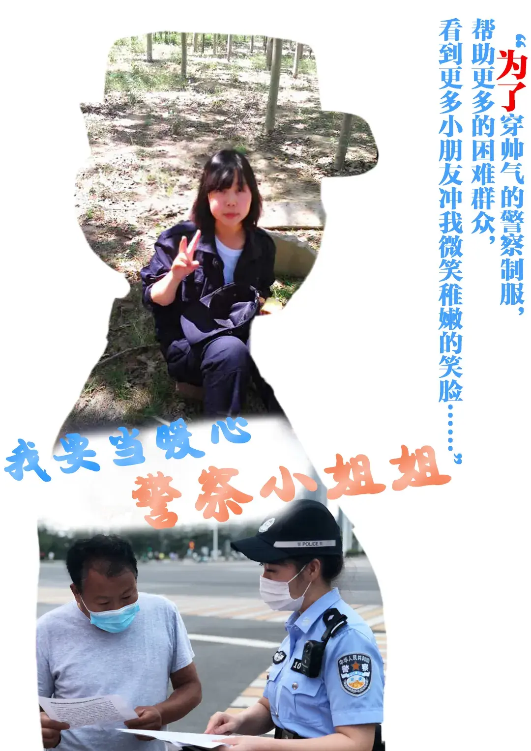 小时候儿歌唱到:我在马路边,捡到一分钱,把它交到警察蜀黍手里面……,小时候的我当时就在想,为什么不是交到警察姐姐手里面呢,为了穿帅气的警察制服,帮助更多的困难群众,看到更多小朋友冲你微笑稚嫩的笑脸……现在我就是一名警察姐姐。
