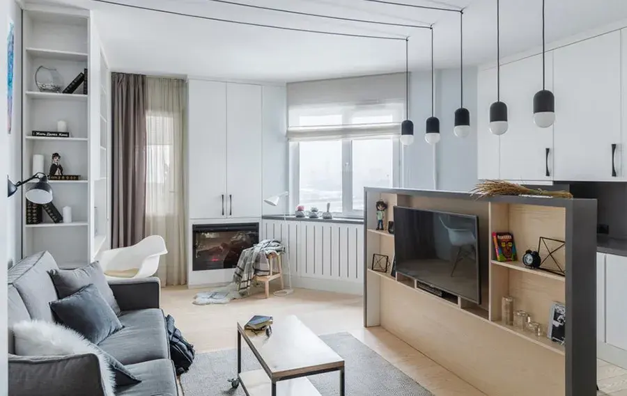 因此将睡眠功能与客厅结合,接着安装折叠式沙发床,满足使用需求。