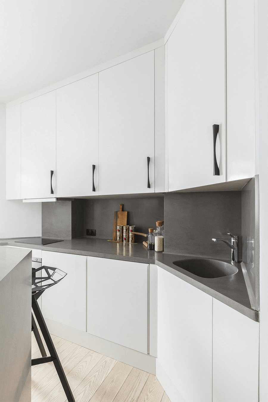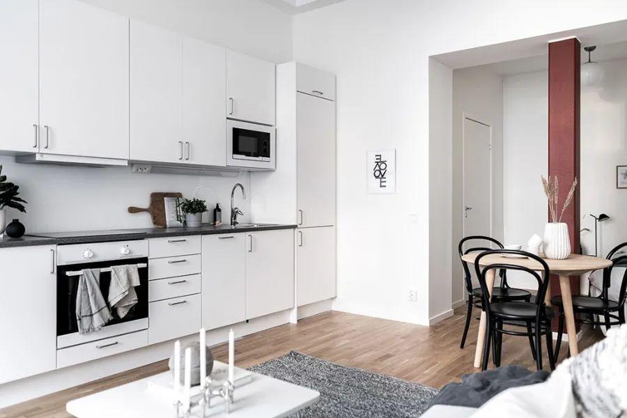 至于厨房,则沿着墙面规划,以最小面积创造最大的使用空间。