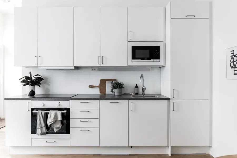 而小小的一字形厨房,则是规划高柜,藉此解决收纳、储存问题。