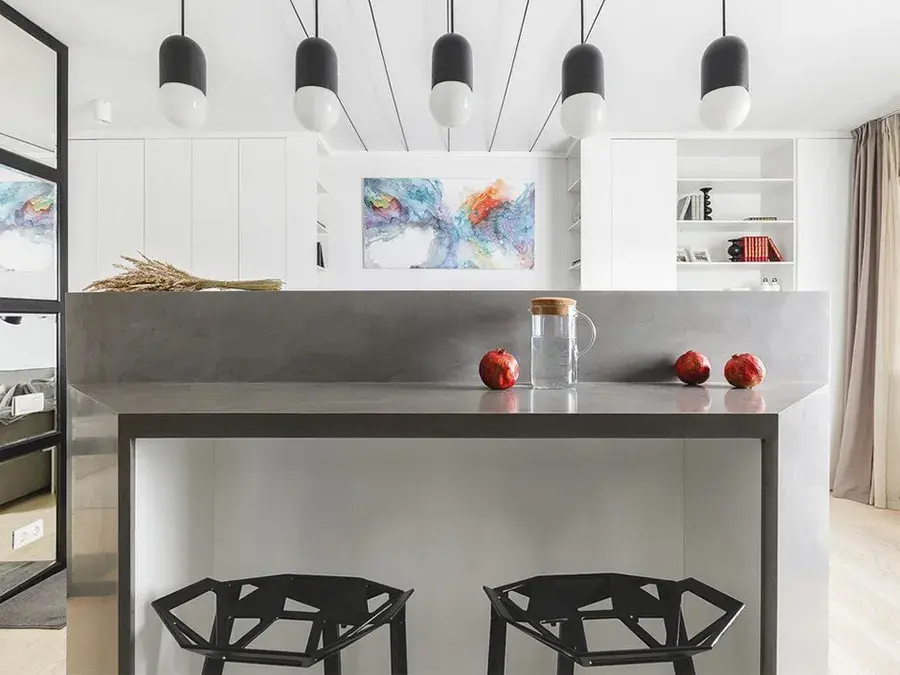 在客厅这一面还是电视墙,但在厨房这一边,就成了吧台桌,