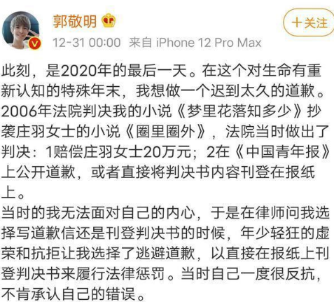 虽说是道歉,但郭敬明话里话外,却将自己抄袭的错误甩给年少无知。