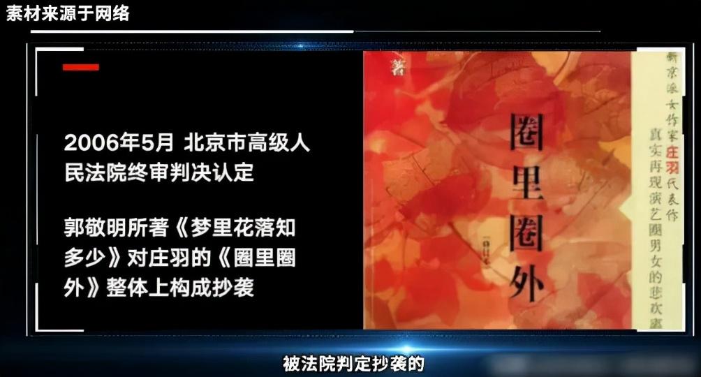 法院判决郭敬明存在抄袭剽窃行为,要求他和所在的文艺出版社赔偿庄羽的21万,并停止销售《梦里花落知多少》和公开向原创作者道歉。
