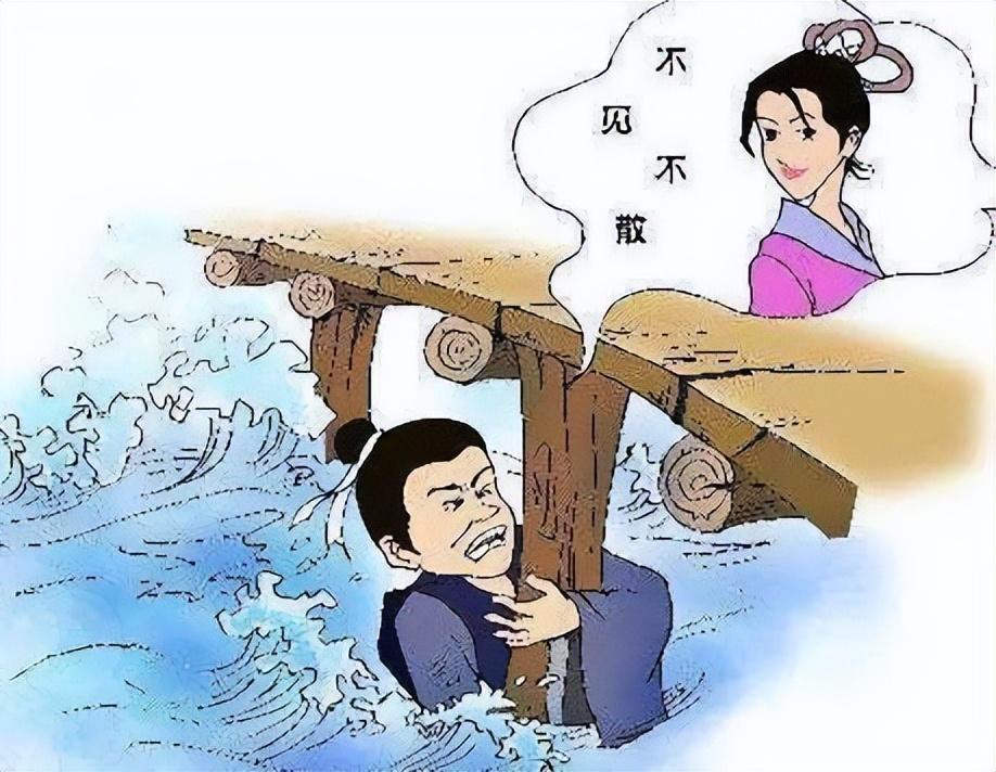 城外桥面,不见不散,尾生想起了与姑娘的信誓旦旦;四顾茫茫水世界,不见姑娘踪影。但他寸步不离,死死抱着桥柱,终被活活淹死。