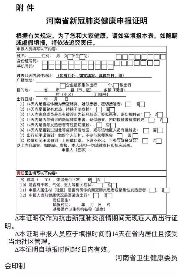 (四)严格筛查评估。基层医疗机构责任医生对申报人员进行体温测量和新冠肺炎症状排查,结合申报人员填报内容、体温测量结果、相关体征以及流行病学史问询情况,实事求是地填写相关内容,作出是否适宜出行的意见,打印《河南省新冠肺炎健康申报证明》加盖基层医疗机构公章。基层医疗机构将适宜参加集体返岗人员信息适时提交给县级人力资源社会保障部门和乡镇政府(街道办事处)。