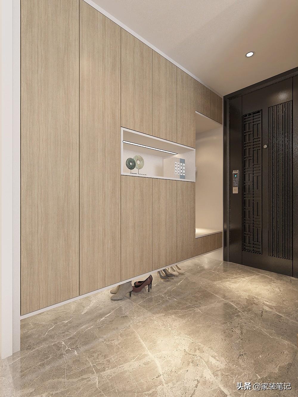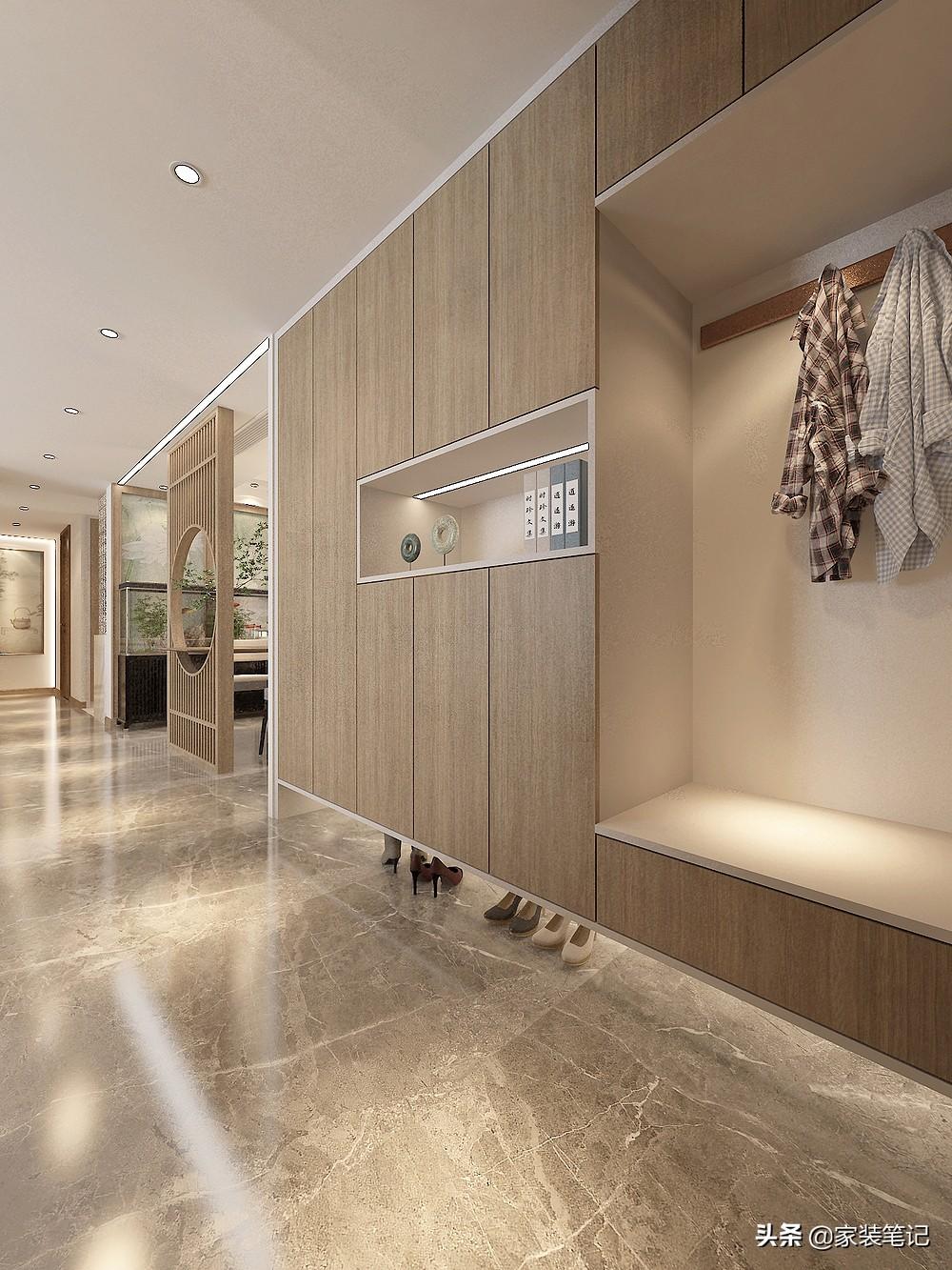 玄关整体给人的感觉:简约、整体、实用;鞋柜做了多功能的规划,有换鞋凳还有挂衣区,另外还做了一门到顶的规划设计,虽然造价高点儿,但是很显档次,尤其是在中式风格里面显得格外有品位。