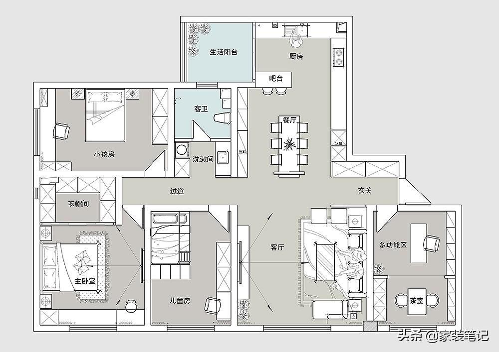 此案例户型从各空间上户型周正,但从总体来看,入户玄关及阳台功能不合格;厨房空间没有窗户,这一点很不好,家里面也只有一个阳台,就得失去休闲阳台了,对于158平米的户型而言,算是有点可惜了。