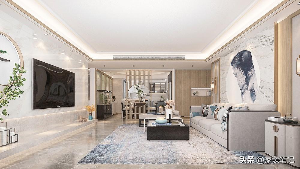 子曰:“智者乐水,仁者乐山;知者动,仁者静;智者乐,仁者寿。”石材、金属、水墨巧妙兼容,舒缓的东方意境是主人特有的情怀;客厅的禅意十足,在沙发墙和电视墙上面都做了比较有意境的圆形造型,顶面是无主灯的造型设计,提升了空间感。