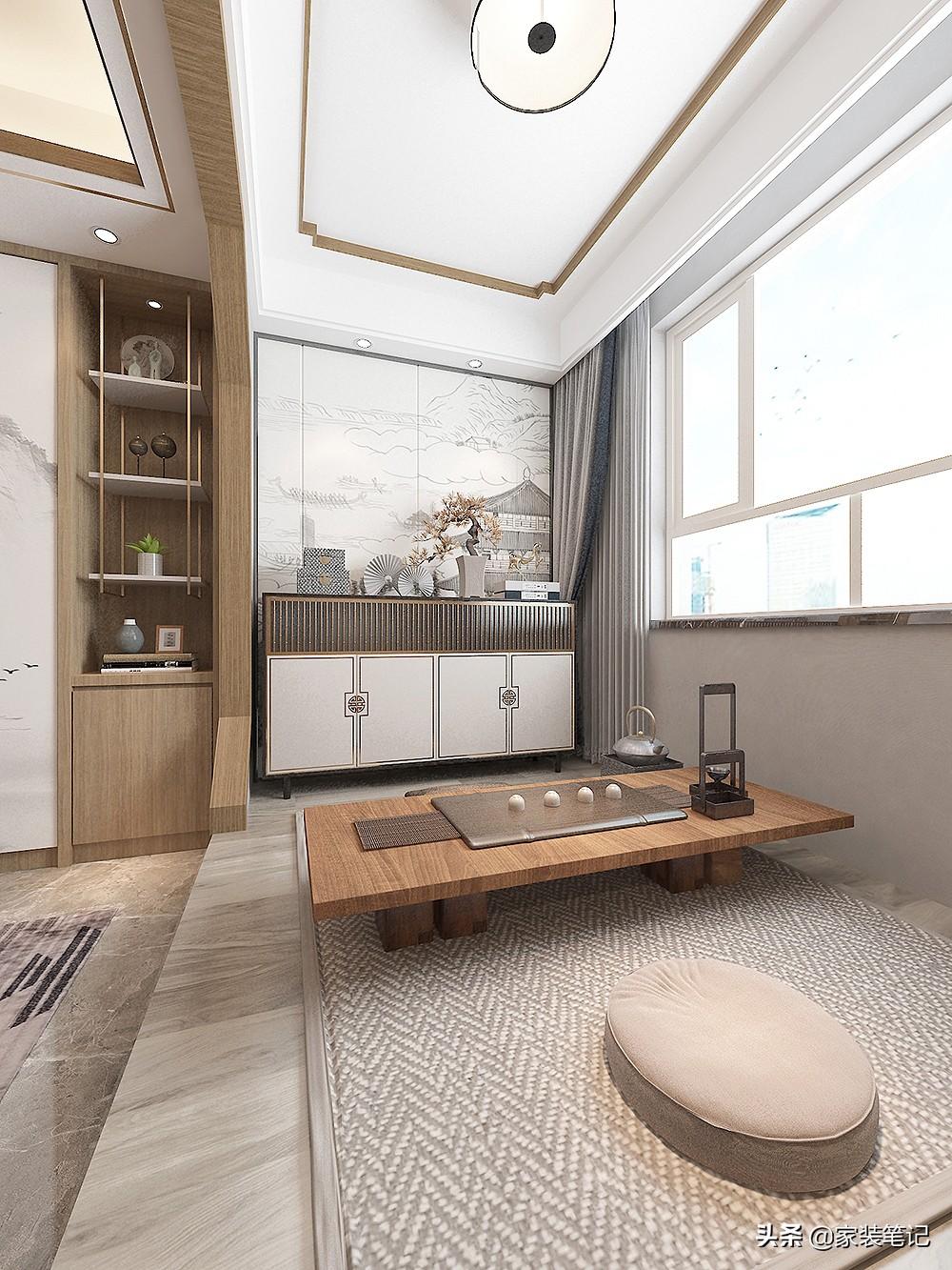 本案例在初接手时,就已开工到瓷砖铺贴阶段了,因此能拆除的都已拆除。在平面方案上仅做微调。重点在茶室、餐厅和厨房上着重设计。在餐厅与厨房之间设计早餐吧台;在书房分一半空间加入茶室的功能,加高地台设计半独立式禅意茶室