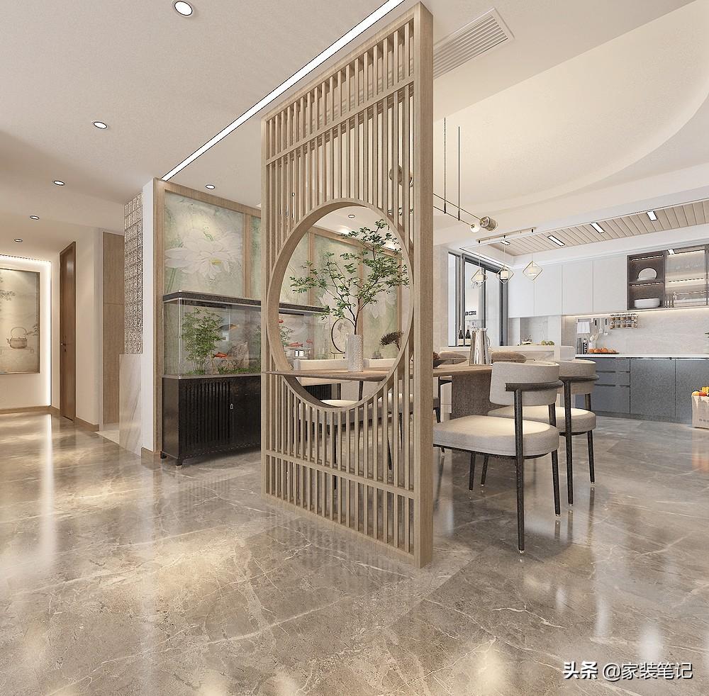 取自然真意,化“禅”韵之景;木的自然肌理,以圆为造型的木隔断的形式融于空间并相得益彰。夹纱营造朦胧悠远的氛围感,上下洗光渲染出疏阔的纯粹之境。餐厅里面还摆放了鱼缸,可以收纳、又是装饰品,而且还很有寓意,“年年有余(鱼)”在餐厅得以体现。