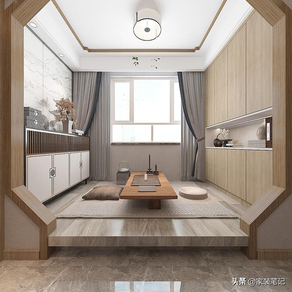 这个空间把它划分成了两个区域出来,在这个中间还做了一个八角门洞出来,将功能空间进行了很好的划分。一部分是书房的功能,另外一部分是茶室的功能,茶室做得席地而坐的“日式”茶房布置,不过这一点最初也是源自于中式文化。