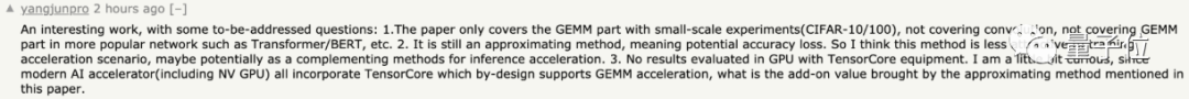①论文用的是VGG16模型,但没有在Transformer等更经典的模型(如BERT)中进行实验;②虽然对矩阵乘法进行了加速,但毕竟只是近似算法,意味着潜在的精度损失;③没有在GPU中测试评估结果。