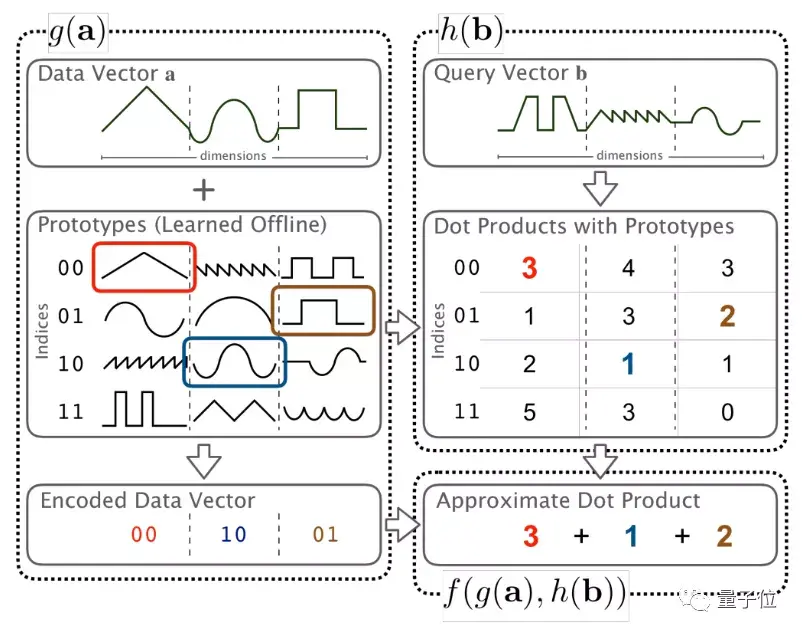 与此同时,这张表格中的每个值,都已经提前做过点积计算了,因此在输出g(a)的同时,它与查询向量(query vector)b对应的近似点积计算结果h(b)也能被查表并输出。