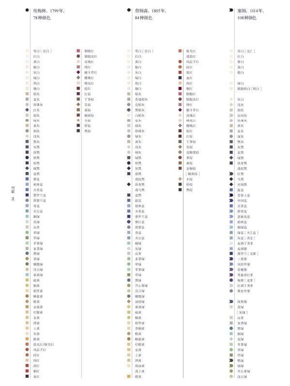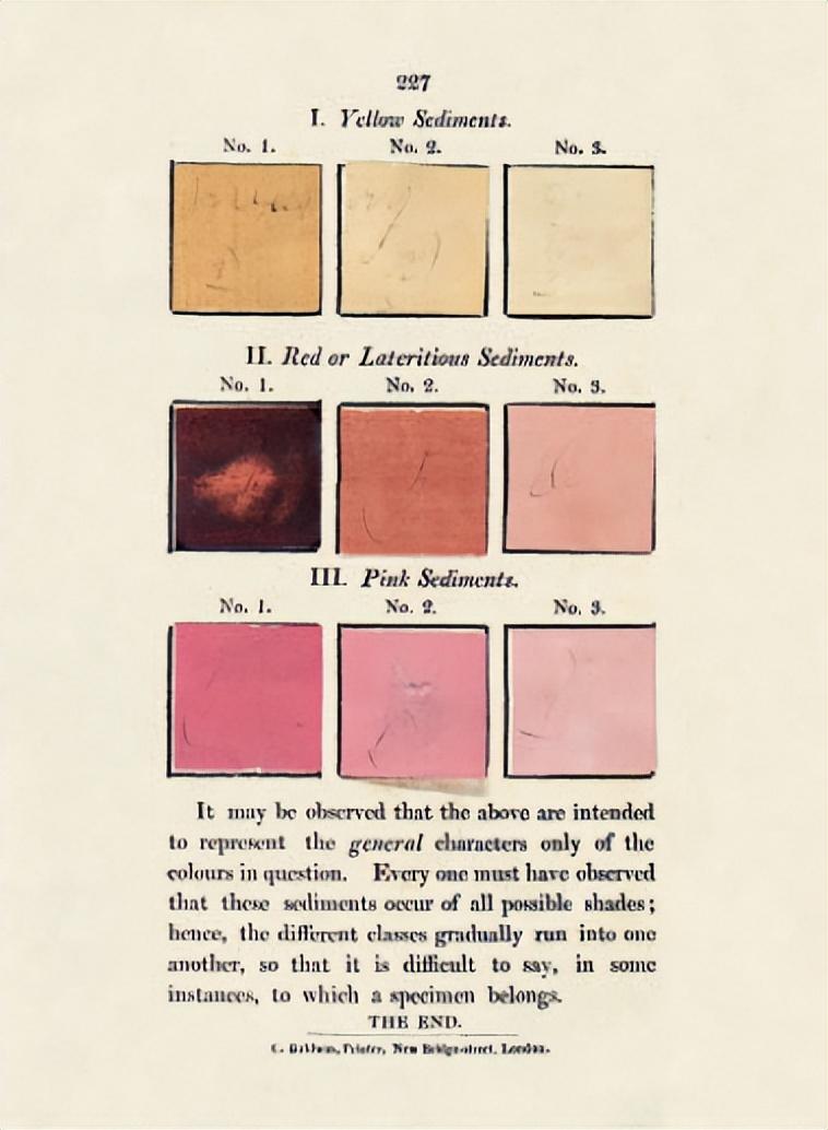 1774年,为了更好地识别和描述矿物,德国地质学家亚伯拉罕·戈特洛布·维尔纳(1749-1817)根据矿物的外物特征,设计出一套分类系统。1814年,苏格兰艺术家帕特里克·塞姆(1774-1845)在维尔纳提供的矿石样例的基础上,补充了动物和植物样例,还给每种标准颜色增加了展示色卡。