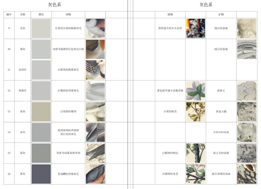 18世纪末-19世纪初,为了能将各种生物物种信息分门别类,建立通用的标准色彩体系对自然学家来说至关重要,艺术家也需要一套标准色彩以便准确地描绘动物、植物和矿物。继维尔纳之后,矿物学家和博物学家们也纷纷创建起自己的标准色彩表。