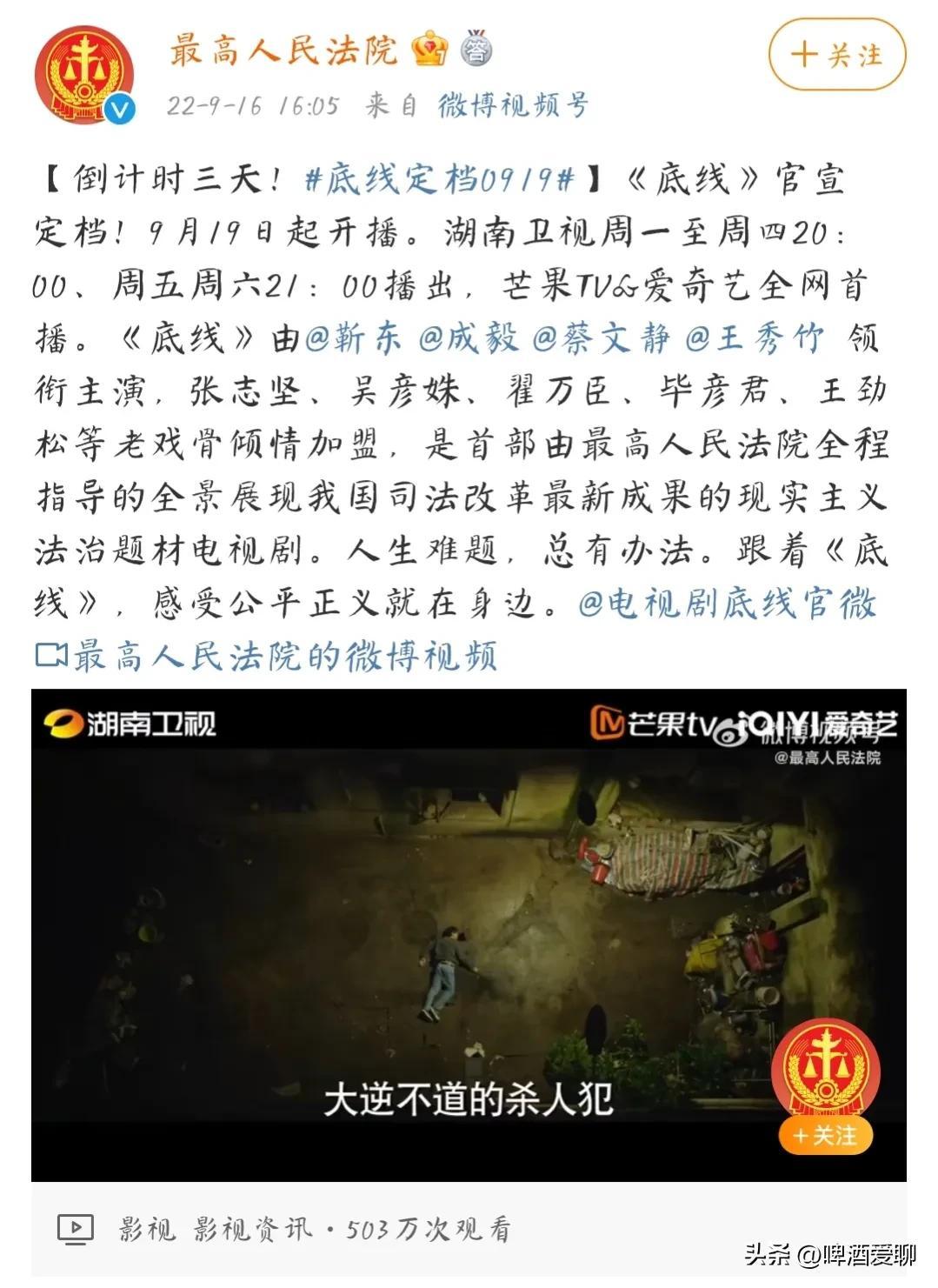 我国的首部法制题材电视剧《底线》定档9月19日。该剧由靳东、成毅主演,由最高人民法院帮忙宣传,各地法院官微转发宣传,真的是不爆不行了。