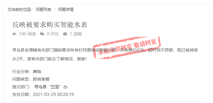 近日,寻乌县水利局会同吉潭镇政府前往调查核实,吉潭镇吉潭村由吉潭镇自来水厂供水,2020年下半年以来,受干旱少雨影响,存在水源供水不足,边缘农户或地势高的农户在高峰期会出现停水现象,水厂采取了分时段供水,保障群众饮用水,同时寻乌县把吉潭村纳入了城乡供水一体化供水区,引接县城大路水厂供水,已实施大路水厂管网延伸至吉潭村。