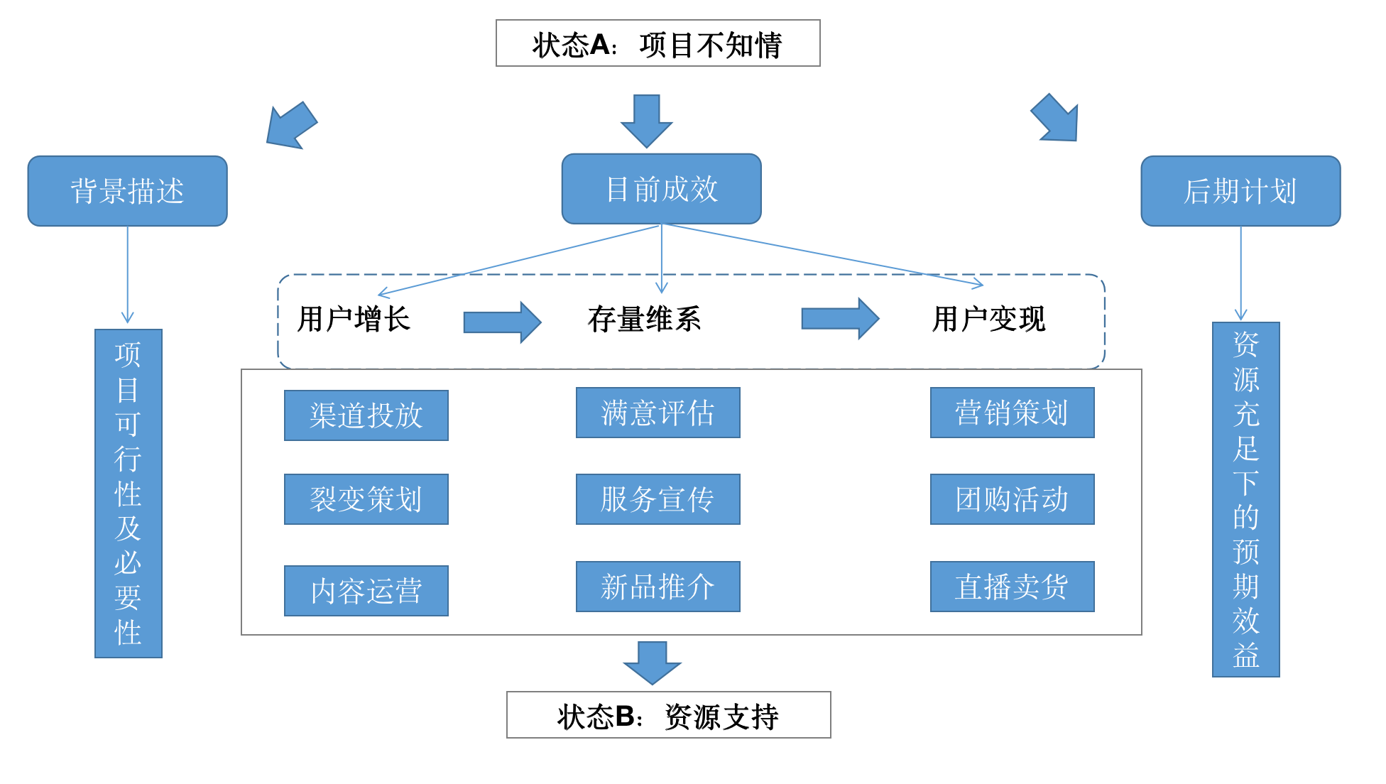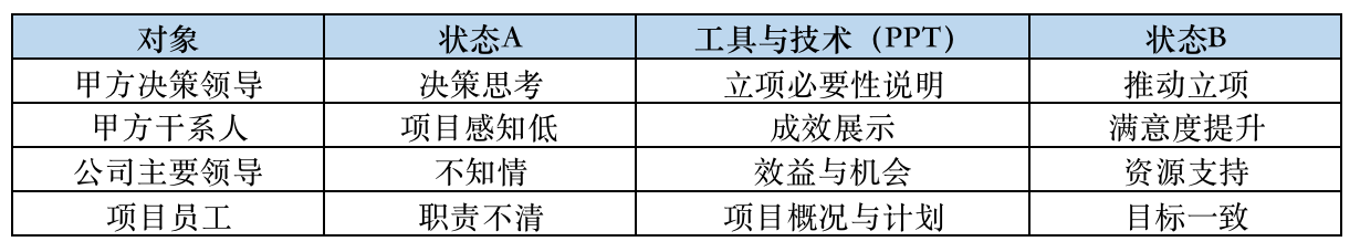 再来说说“目标”,“目标”就是通过PPT这个工具让“对象”从A的状态转变为B的状态,这句话按照项目管理中的场景可以这么去理解: