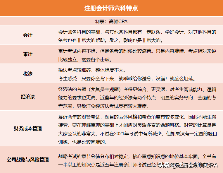 前面也说到注会专业阶段六科各有各的“个性”,如大家可能印象比较深刻的《会计》内容多,《审计》知识点难以理解,《财管》计算量大,《税法》又被称之为“碎法”,《经济法》和《战略》记忆内容多。具体各科特点可通过以下表格来了解一下: