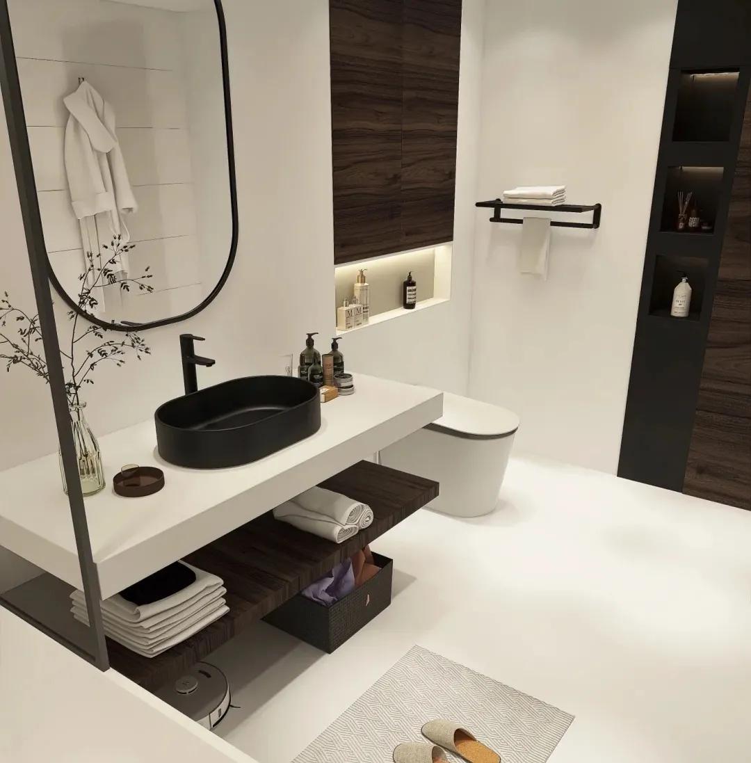 也有很多设计师尝试新中式风格的卫生间结合微水泥的设计,看起来非常的流畅和简洁,线条感非常流畅。